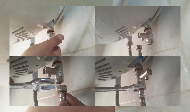 قم بعد التاكد من عدم نزول او تسريب ماء من مكان ربط صمام الامان ، قم بربط وصلة الماء البارد فى مكانها اسفل شيك بلف السخان بمفتاح 24 ناحية اليمين كما يظهر فى الشكل رقم 1