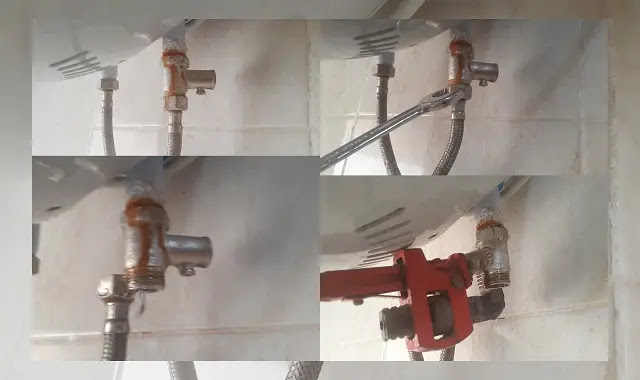 ان تبين ان ، بلف السخان بينقط ، صمام الامان في السخان الكهربائي بينقط ، بعد فك وصلة البارد فيكون شيك بلف السخان تالف وعليك تغييره وقم بفتح شيك بلف السخان بمفتاح رقم 25 كما يظهر فى الشكل رقم 2
