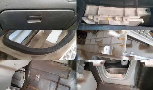 قم باخراج الجزء العلوى وقم بالتصوير للمراجعة فى تركيب الاجزاء ، قم بتحرير الغطاء الخاص بادخال فلتر المكيف الذى قد يظهر فى مواجهتك من خلال تحرير عدد 2 او اكثر من الكلبسات بسحبهم الى الخارج فى مواجهتك ثم حرر غطاء ، مكان فلتر مكيف السيارة